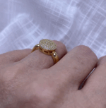 O anel banhado a ouro 18k. O banho de ouro 18k garante não apenas uma aparência dourada vibrante, mas também maior durabilidade e resistência, mantendo o brilho e a beleza da peça por muito mais tempo. As zircônias, delicadamente posicionadas, adicionam um toque de brilho extra, imitando o brilho do diamante, e conferem ainda mais elegância à peça. Ideal para ocasiões especiais ou para dar um charme extra ao dia a dia, esse anel une beleza, resistência e um design atemporal.