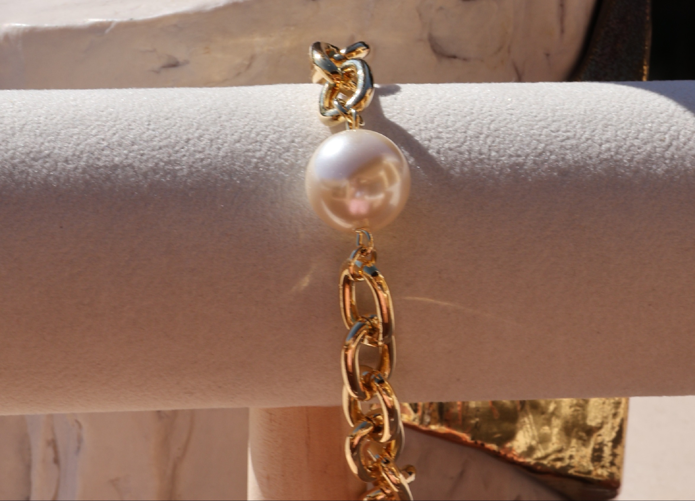 Um clássico reinventado: elos robustos em banho de ouro 18k unidos à delicadeza atemporal da pérola.